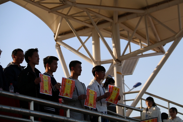 下午6时,运动会圆满结束,参加闭幕式的领导为获得团体总分前六名和体育道德风尚奖及拼搏奋斗奖的代表队依次颁奖。