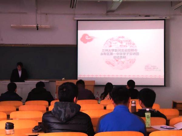 为发挥广大在校生与高中生源学校的纽带作用,传播兰大文化,弘扬兰大精神,学校在2018-2019学年寒假期间组织开展了“兰大使者母校行”活动,学院积极参与组织了8个个人、23个团队赴河北省开展宣传实践活动。为了进一步总结经验成果, 3月16日,我院在天山堂A203室举行“兰大使者母校行”(河北地区)结项答辩,学院团委书记侯海坤、辅导员赵永伟、团委学生会常委张肖月、耿少琼、梁丰担任答辩评委。