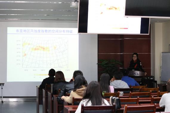 陈思宇老师的报告题目是《塔克拉玛干沙漠和戈壁沙漠起沙、传输和沉降的对比研究》。陈老师在报告中详细地论证了相较于塔克拉玛干沙漠,戈壁沙漠层结更加不稳定,对流活动旺盛,且受西风急流影响较大,因而中低层风速较大,虽然总起沙量不如塔克拉玛干沙漠,但向东部地区传输的条件更为有利,因此其向东传输的沙尘总量更大这一观点。报告逻辑清晰、层层递进、通俗易懂。在谈及研究课题的灵感来源时她提到,“我们的很多灵感都是基于以前的研究工作”,这给接触科研不久的研究生一个很好的启示:大量阅读文献站在巨人的肩膀上会帮助我们站得更高望得更远。