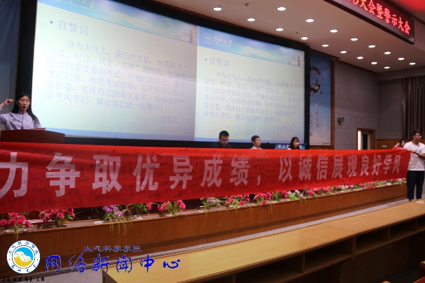 以实力争取优异成绩,以诚信展现良好学风。为了对期末考试进行动员,强调考试纪律,我院召开了2017年考前动员大会,曹老师对期末考试需要注意的问题进行了介绍,包括考试需要携带的证件文具,按时进入考场以及补缓考注意事项。最后,我院2016级大气科学类4班王濛同学带领全院同学进行考前宣誓,动员大会结束。