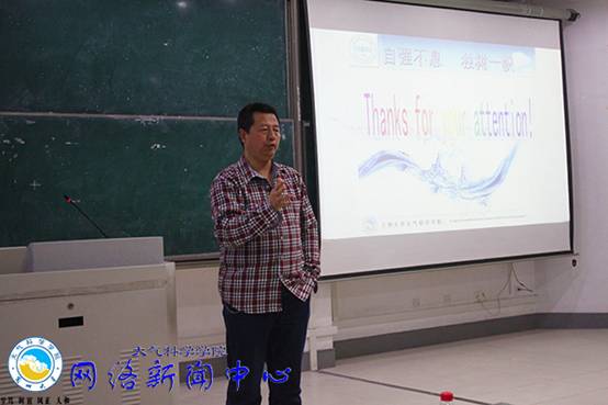 讲座伊始,张文煜教授就用其轻松幽默的语言为同学们诠释了“什么是大气科学”这一问题,后又借用诸葛亮草船借箭等气象典故说明了气象在生活、战略上的重要作用。紧接着,张文煜教授介绍了包括大气探测学、大气物理学、大气化学、气象动力学在内的几大分支学科。而讲到自己的专业大气探测学时,张文煜教授尤为滔滔不绝,他向同学们展示了卫星云图、云的三维动态分布图等。或许在他看来,图像不仅是大量观测资料的缩影,更是无数气象人辛劳付出的见证。同时,张文煜教授也多次提到,大气科学中有些方面的研究刚刚起步,需要未来在座同学们的不断摸索、长久奋斗。“自强不息,独树一帜”的八字箴言表达了张文煜教授对同学们的期许。
