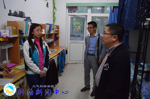 晚上七点左右,张大伟书记等一行人先后到榆中校区3、4和17号宿舍,深入了解同学们的生活学习情况。起初,对于老师的突然到访,同学们都略显拘谨,但简短的交流之后,大家便熟络起来。聊学习、拉家常,一股温馨在简单而又整洁的宿舍弥漫。张大伟书记在详细查看和了解宿舍的安全状况之后,向同学们普及了简单的急救知识。每到一处,他都反复强调安全与卫生问题,以保证同学们宿舍生活文明有序地进行。如今正值夏季,天气炎热干燥,细菌易于滋生,他提醒大家宿舍要经常通风,垃圾及时清理,营造干净整洁的宿舍环境和积极向上的学习氛围。他希望大家都能够热爱生活,以积极饱满的热情投入学习,度过一段积极向上、充满美好回忆的大学时光。司文选老师对同学们说,不管是学习或是生活上遇到了问题,都要主动向学院提出,学院会帮大家及时解决。司老师希望同学们能在接下来的时间里,沉下心来,踏踏实实的做好自己,充实的走过大学生活的每一步,为未来美好的职业生涯打好基础。走访期间,辅导员史万峰老师向张大伟老师和司文选老师介绍2014级同学们的学习近况。