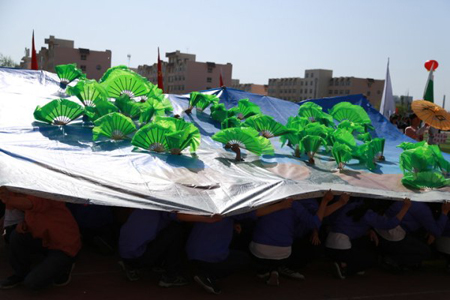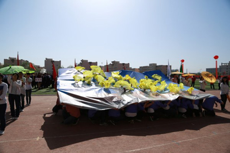 在本次体育运动会开幕式中,党委书记雷晓云、副院长毛国梁、党委副书记司文选带领九十四位学生代表学院参加了运动会方阵风采展示。 风采展示中,我院匠心独具,用大型树干图样喷绘结合扇子的变换,以四种不同颜色扇子代表四季,绿色的春季、火红的夏季、金黄的秋季、飘雪的冬季带给了观众强烈的视觉冲击,赢得阵阵欢呼。